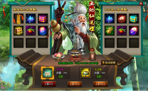 活动奖励:可在土地仙送礼中有几率获得至尊双属性宝物(至尊霹雳珠)、1~5级魂石礼盒、炼化石、5~6级符石礼盒、装备附魔石、七彩凤羽、洗练锁、猜拳令等。