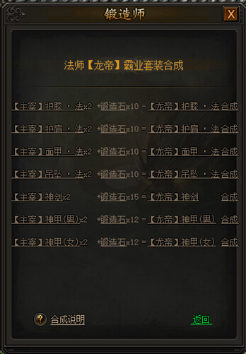 在*锻造师处,即可将【主宰】霸业神剑神甲与锻造石进行融合,进而合成为【龙帝】霸业神剑神甲,属性更强力,外观更酷炫,助你征战传奇!
