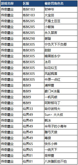 本次因为非法使用外挂的玩家被封禁的玩家名单如下: