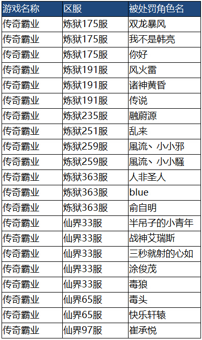 本次因为非法使用外挂的玩家被封禁的玩家名单如下: