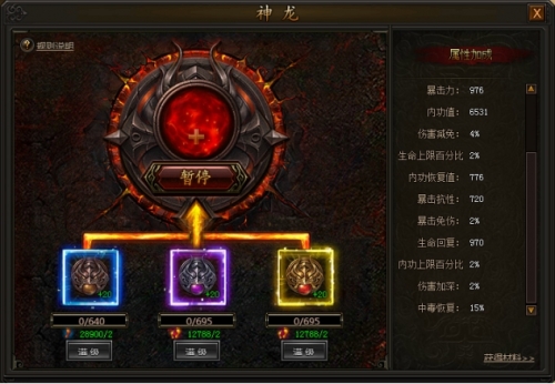 1.2龙印培养:消耗低级、高级龙印材料可对龙印底板进行升级,升级龙印可获得大量属性加成;龙印材料可通过跨服魔王祭坛、商城购买等方式获得;
