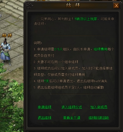 2.1系统开启:角色等级达到转生5级,即可在*进行结拜;