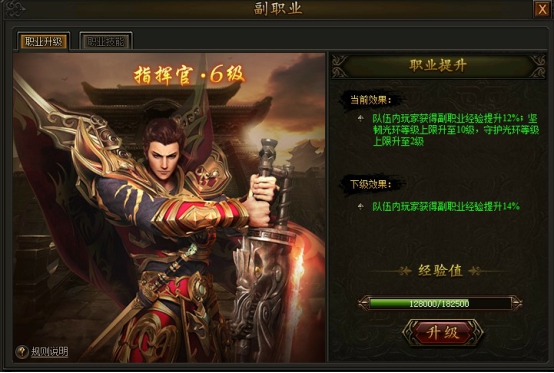 c) 副职业技能:随着职业等级提升,指挥官可以解锁多个技能,需要消耗指挥官技能秘籍激活生效;升级需消耗指挥官技能秘籍和副职业技能卷轴,提升技能效果;指挥官部分技能有最大等级上限,提升职业等级可提升该技能等级上限;