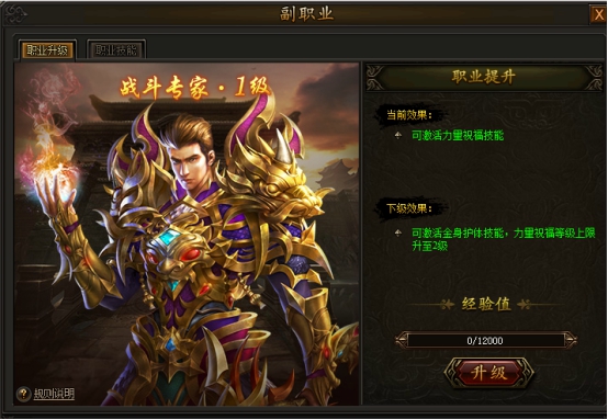 c) 副职业技能:随着职业等级提升,战斗专家可以解锁多个技能,需要消耗战斗专家技能秘籍激活生效;升级需消耗战斗专家技能秘籍和副职业技能卷轴,提升技能效果;战斗专家部分技能有最大等级上限,提升职业等级可提升该技能等级上限;