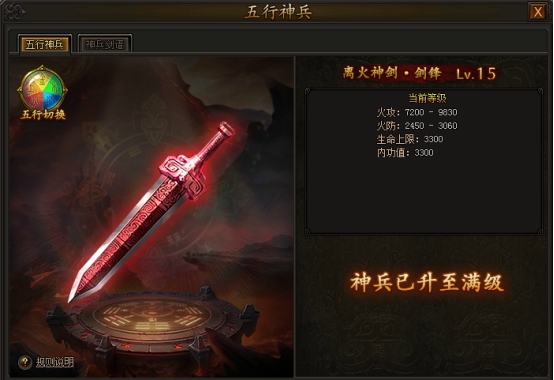 2) 神兵培养分为剑柄、剑身和剑锋三个部位,可消耗一定属性的五行原石依次进 行培养,可获得大量五行属性;
