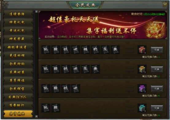 活动说明:活动期间,击杀BOSS有概率掉落字帖,集齐一定数量可兑换奖励