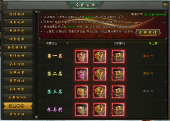 活动说明:活动期间,消费达到300000钻石的玩家参与排行,排名前三的玩家可获得珍贵装备、稀有道具等奖励,奖励在活动结束后以邮件的方式进行发放