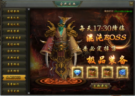 活动说明:活动期间,每天17:30降临混沌BOSS,击杀必定掉落极品装备