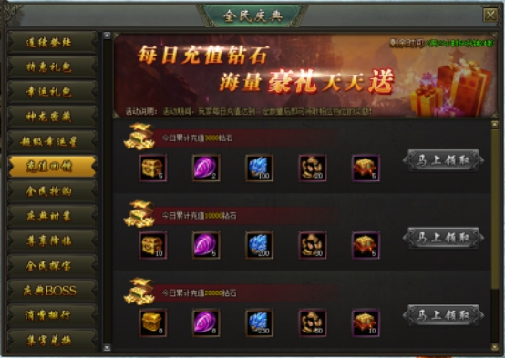活动说明:活动期间,玩家每日充值达到一定数量后即可领取相应档位奖励!