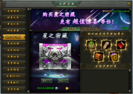 活动说明:活动期间,玩家可使用幸运星开启星之密藏获得随机奖励,开始密藏时有几率获得2倍奖励,更有机会额外获得极品道具奖励