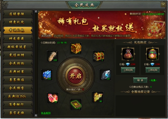 活动说明:活动期间,购买礼包获得抽奖次数,购买礼包次数和抽奖次数每日0点重置。