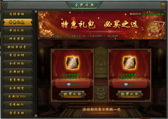 活动说明:活动期间,可购买特惠礼包,每个礼包每日限购1次,每日刷新!