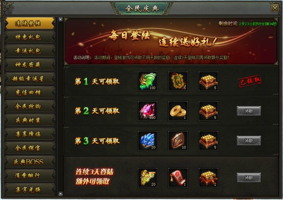 活动说明:活动期间,登陆游戏可领取不同天数的奖励,连续3天登陆可再领取额外奖励