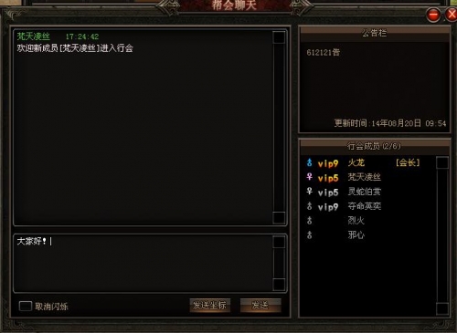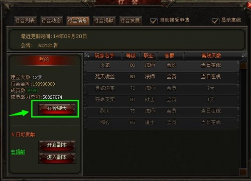 玩家也可以通过点击快捷物品栏上方行会图标(快捷键U)打开行会面板,与行会玩家进行群聊,加深行会友情!