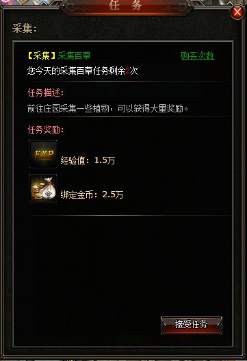 1.每日可在热血城“采集”NPC处接取2次采集任务,奖励大量经验和绑金。