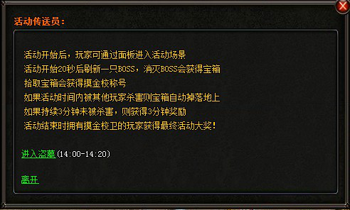 进入活动前要准备好大量的药水,进入活动后击杀BOSS可以获得一个宝箱拾取宝箱有得到一个【摸金校尉】的称号,如果不是自己得到那么他就是你追杀的对象 反之你头要有【摸金校尉】的称号的话 嘿嘿????那你就块跑吧!可以让公会的人协助你一起保护这个宝箱,拾取宝箱三分钟之后会得到一些绑定金币的奖励,持有宝箱的时候越长获得奖励越多。