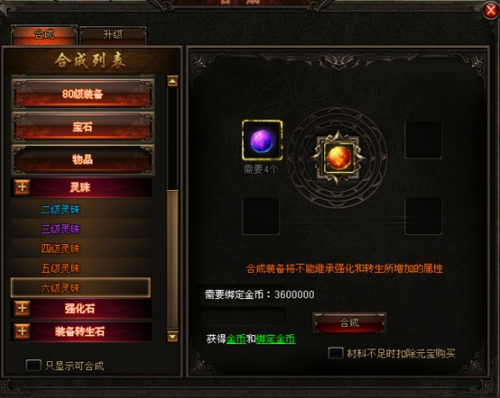 进入合成界面针对各职业等级合成不同等级的职业装备,同时还有宝石、物品合成,玩家通过低级装备的累计也能轻松获得高等级极品属性装备呢!