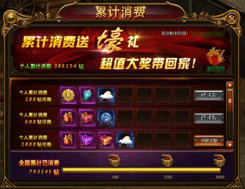 2、活动期间全服总消费每达到一定额度后,所有人均可获得一份免费大礼包。