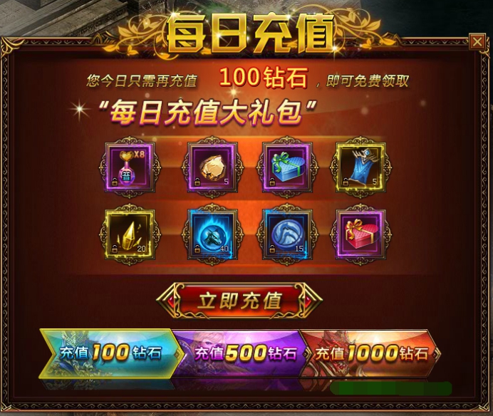 活动期间,每日累计充值分别达到100钻、500钻、1000钻,均可领取丰厚奖励;