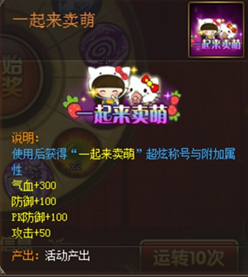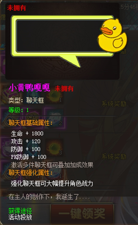 小黄鸭嘎嘎聊天框(永久)*1、白金法宝*1、四级宝石之魂*3、三级护符重置丹*3、图腾精炼石*10、+10强化保护符*1、万能宠物卷*1、万能幸运石*1 |