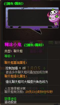 糊涂小鬼聊天框(30分钟)*1、寻宝券*2、风色转盘符*1、妖精饼干*3、中级强化宝石*5、神秘商店令牌*1、万能聊天框碎片*1、尊6强化保护符*1 |