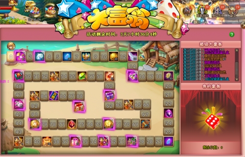 活动规则:活动期间,每充值300钻石可获得一次投掷骰子的机会,根据骰子投到的数字在风色富翁中前进相应格子数,获得相应奖励。更有八阶坐骑装备礼盒、翅膀资质丹、坐骑资质丹、八级宝石之魂、十二阶兑换卡、超值五星兑换卡等超级福利等你哦。