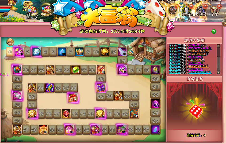活动规则:活动期间,每充值300钻石可获得一次投掷骰子的机会,根据骰子投到的数字在风色富翁中前进相应格子数,获得相应奖励。更有八阶坐骑装备礼盒、翅膀资质丹、坐骑资质丹、八级宝石之魂、十二阶兑换卡、超值五星兑换卡等超级福利等你哦。