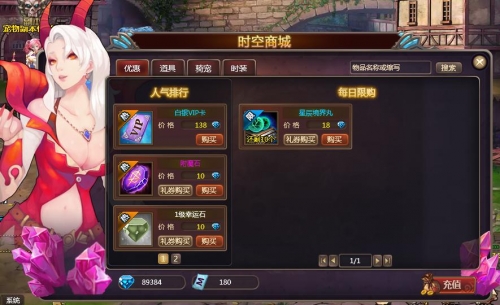商城 时空商城,应有尽有,欲买从速,机不可失,失不再来哦! 1.点击屏幕右下角商城图标,即可打开商城面板哦!神域商城分为优惠,道具,骑宠,时装4个商品专栏。