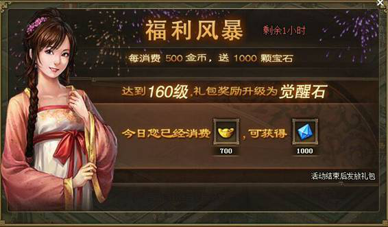 活动内容:活动期间,每次累计消耗满500金币,不同等级可对应获得一份宝石大礼。而160级以上玩家,则可获得觉醒石。