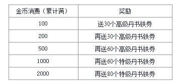 *注:奖励可累计领取(例:购买资源副本累计消费满2000金币,共可获得120个高级丹书铁券、140个特级丹书铁券)