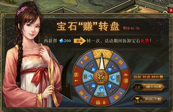 活动内容:活动期间,分别存在“宝石”和“转盘”两个转盘,按照自己的需要,可随心所欲的选择转盘,获得宝石或镔铁。