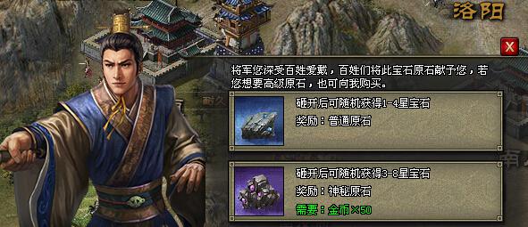 活动内容:活动期间,世界上会出现“宝石原石”事件、玩家可选中免费原石,也可花费金币获得高级原石。获得原石后,玩家可在活动界面,消耗“砸原石次数”将“宝石原石”砸开获得宝石。(※ 活动特惠:本活动期间,摘取已镶嵌在兵器上的宝石,免费!)