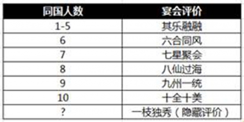 e)参宴的10人中,同一国家的人数越多,该国玩家获得的宴会评价越好,点券数量越多。