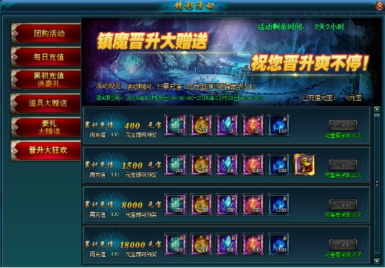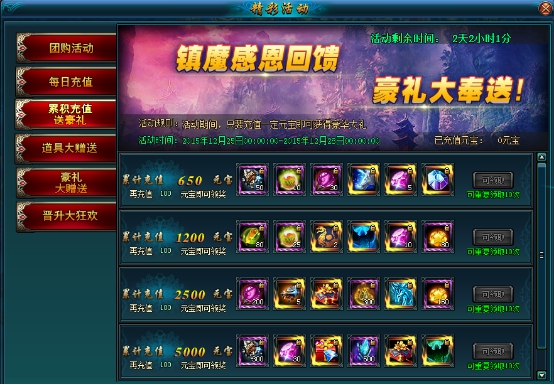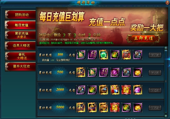 活动内容:活动期间内每天充值累计到一定的金额都可以领取丰厚的大礼!