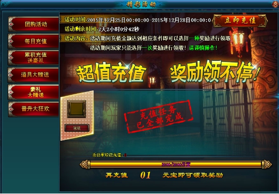 活动规则:活动期间,每天玩家累计充值满200元宝,可以选择领取一个奖励,每天最多可以领取100次奖励,累计充值元宝每天24点清零