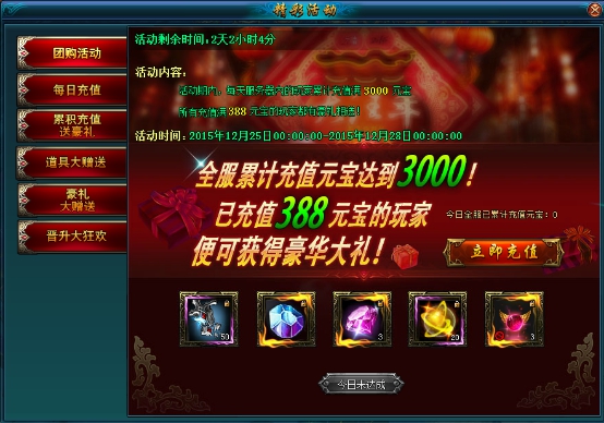 活动规则:活动期间内,全服累计充值满3000元宝,充值满388元宝的玩家即可获得豪华大礼!