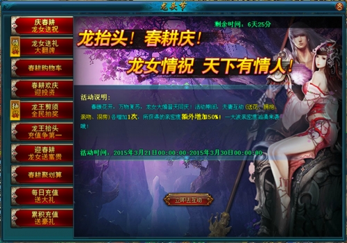 活动说明:活动期间,夫妻互动(送花、拥抱、亲吻、洞房)各增加1次,所获得的亲密值增加50%!