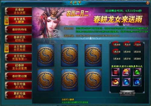 活动内容:活动期间玩家登陆游戏,在线时长达到对应条件,即可获得免费翻牌机会,花费元宝可再次获得该道具。补签之前天数也可获得保底奖励。玩家累计连续登陆九天天还可以额外获得超值豪礼!