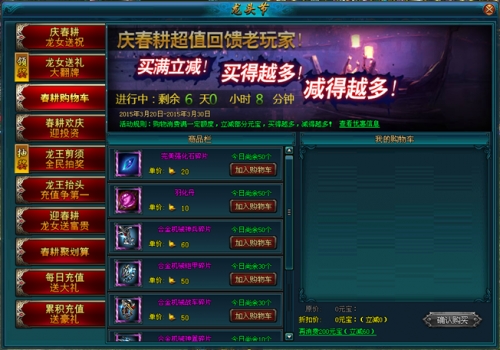 活动内容:在活动期间,购物消费满一定额度,立减部分元宝,买得越多,减得越多!