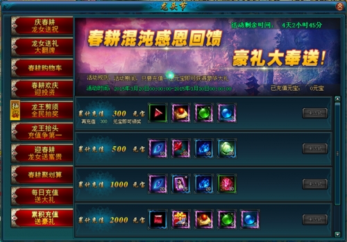活动规则:活动时间内,玩家每天充值一定的元宝都可以获得丰厚的礼包