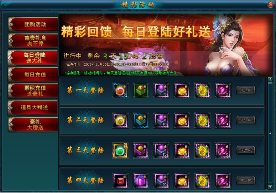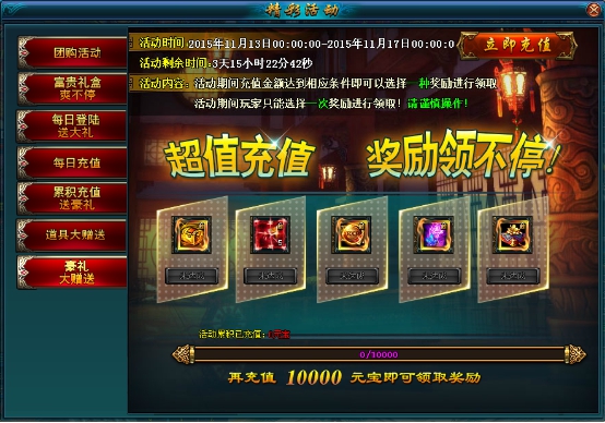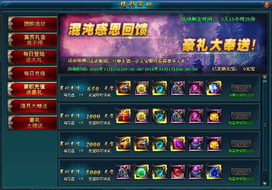 活动说明:活动期间,玩家每天充值一定元宝都可以获得丰厚大礼!