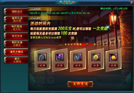 活动规则: 活动期间,每日玩家累积充值满200元宝时,便可以领取一次奖励,玩家每天最多可以领取100次奖励!
