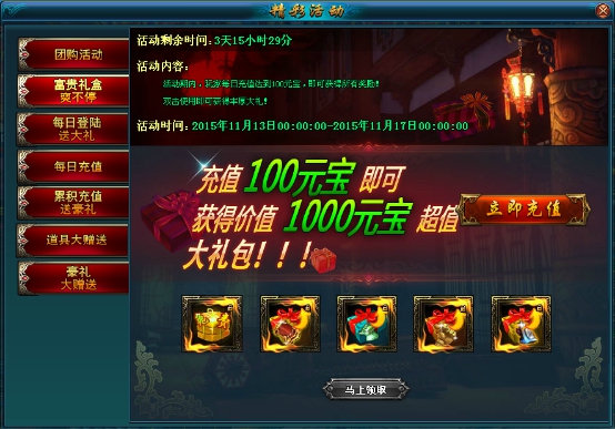 活动规则:活动期间,只要充值一定元宝即可获得豪华大礼!