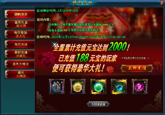 活动说明:活动期间,每天服务器内的玩家累积充值满2000元宝,所有充值满188元宝的玩家都有豪礼相送!