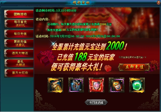 活动规则:活动期间内,全服累计充值满2000元宝,充值满188元宝的玩家即可获得豪华大礼!