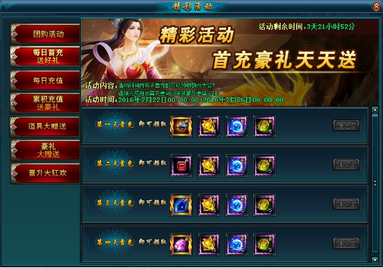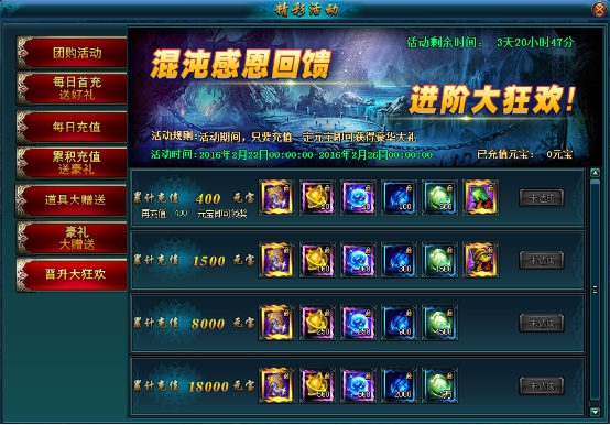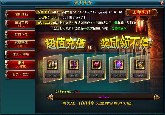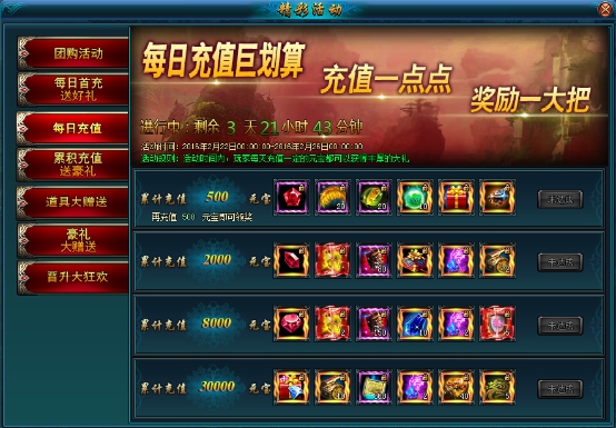 活动内容:活动期间内每天充值累计到一定的金额都可以领取丰厚的大礼!