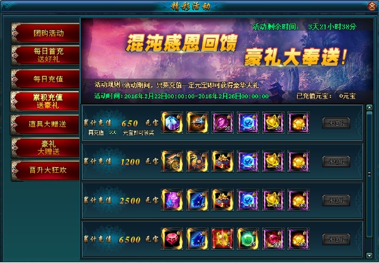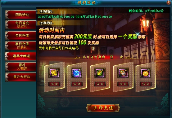 活动规则:活动期间,每天玩家累计充值满200元宝,可以选择领取一个奖励,每天最多可以领取100次奖励,累计充值元宝每日24点清零