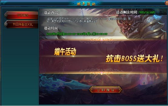 活动内容:活动期间内,每天中午12:30-13:00,晚上18:00-18:30,都会有BOSS入侵,玩家只要参与抗击BOSS就可以获得珍贵道具奖励!
