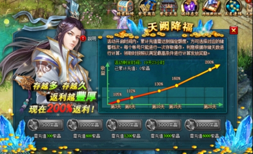 2.有五个档次的存款金额供玩家自由选择,选择不同档次的投资金额需满足:在本次活动开启时间内,玩家累计充值金额需满足指定的额度,才够可选择相应的档次进行投资。