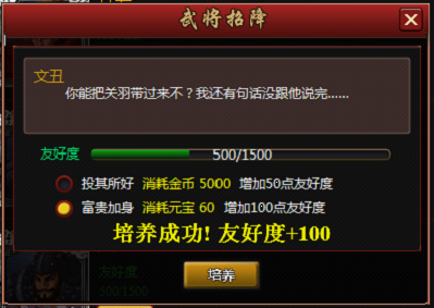 根据当前【我的声望】值可解锁不同等级的武将,已经解锁的武将,可以通过点击【培养】按钮,培养与武将的友好度。
